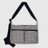 Two exterior pockets, interior zip pocket, measures 7.9" H × 11.8" W × 4" D, adjustable 47" logo strap, recycled heavyweight nylon with recycled ripstop nylon lining, machine washable.