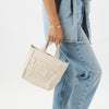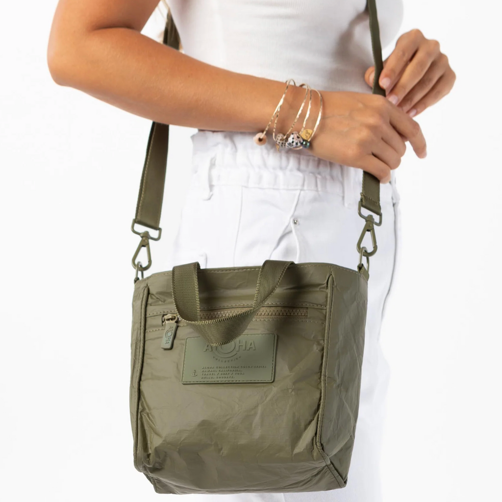 Zipper top, outside and inside zipper pocket, removable strap, 7.5" W 7.75" H with a 4" gusset at the bottom, removable Crossbody Strap extends to 53", 11" Handles, capacity: 3.8 LTR, features an Olive interior.