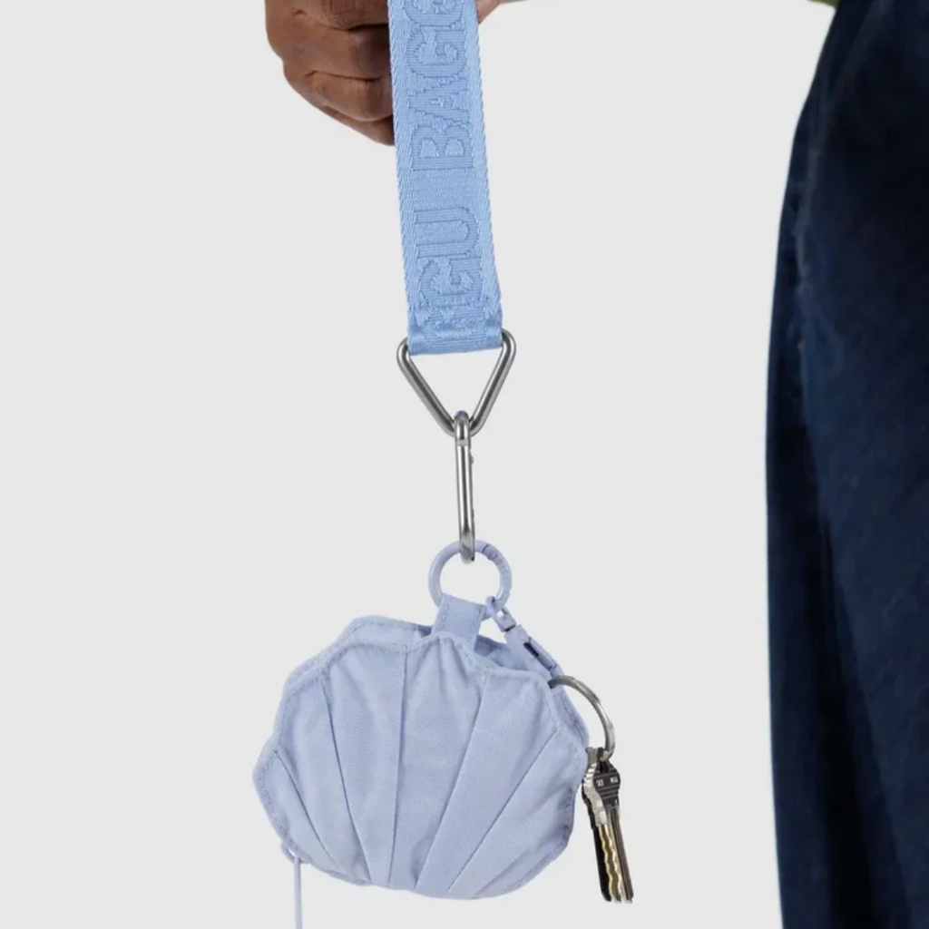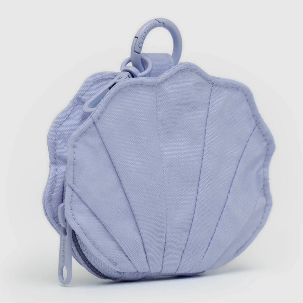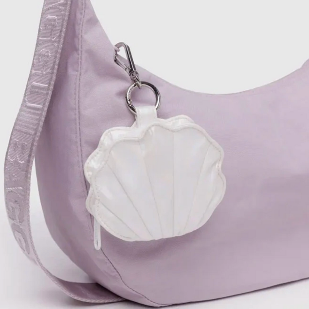 The shell charm decorates your larger bag while keeping small bits and pieces close at hand, or carry as a cute little coin purse.